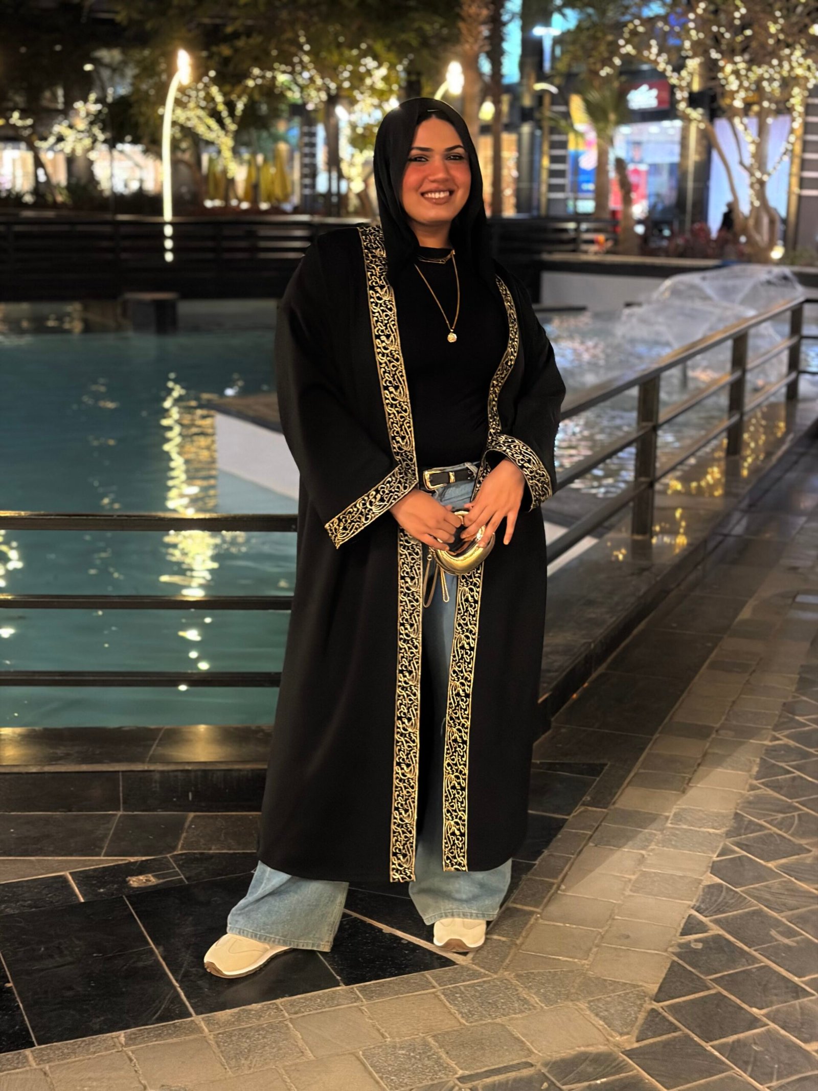 A timeless black kaftan adorned with elegant Arabic letter embroidery, blending cultural heritage with modern sophistication.